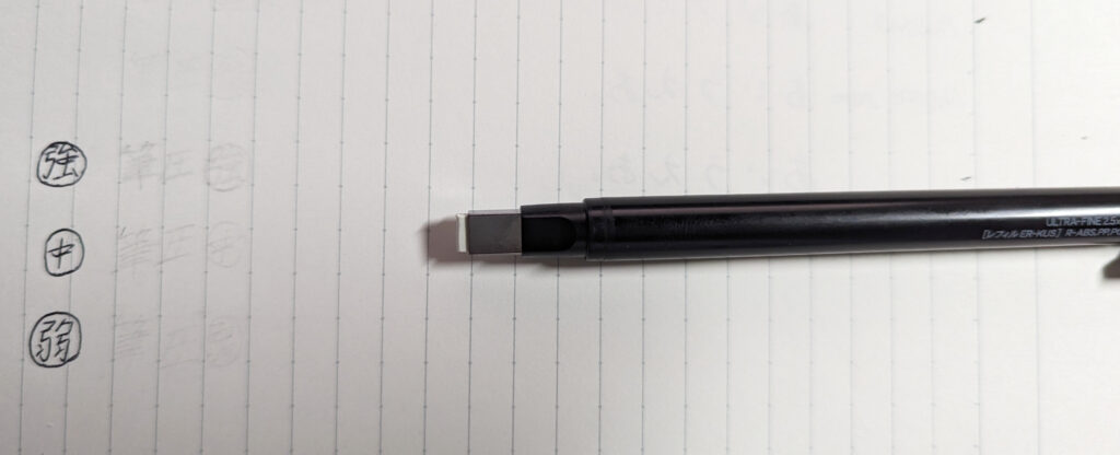 ↑消字能力の比較。そこそこ消えているように見えるが、途中から消えにくくなる。消しカスはパサパサとしている。消しゴムの減る速度は遅め。